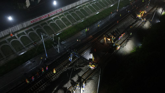 27日早晨6時許,經(jīng)過上千人冒雨作業(yè)7小時,引江濟淮滬蓉鐵路改建工程順利完成。