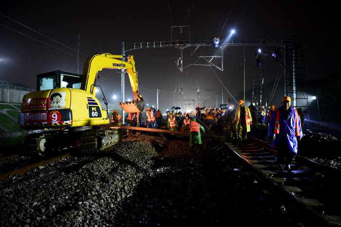 據(jù)施工方介紹,這是國內(nèi)高鐵建設(shè)史上首條雙線撥接的高速鐵路。施工需要避開列車運行時間,只能在晚上進行。
