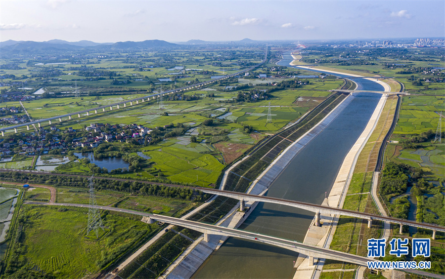 6月28日,安徽省合肥市廬江縣柯坦鎮(zhèn)境內(nèi)的引江濟(jì)淮工程雄姿展現(xiàn),河道、高鐵、公路在綠野中交匯,景美如畫。
